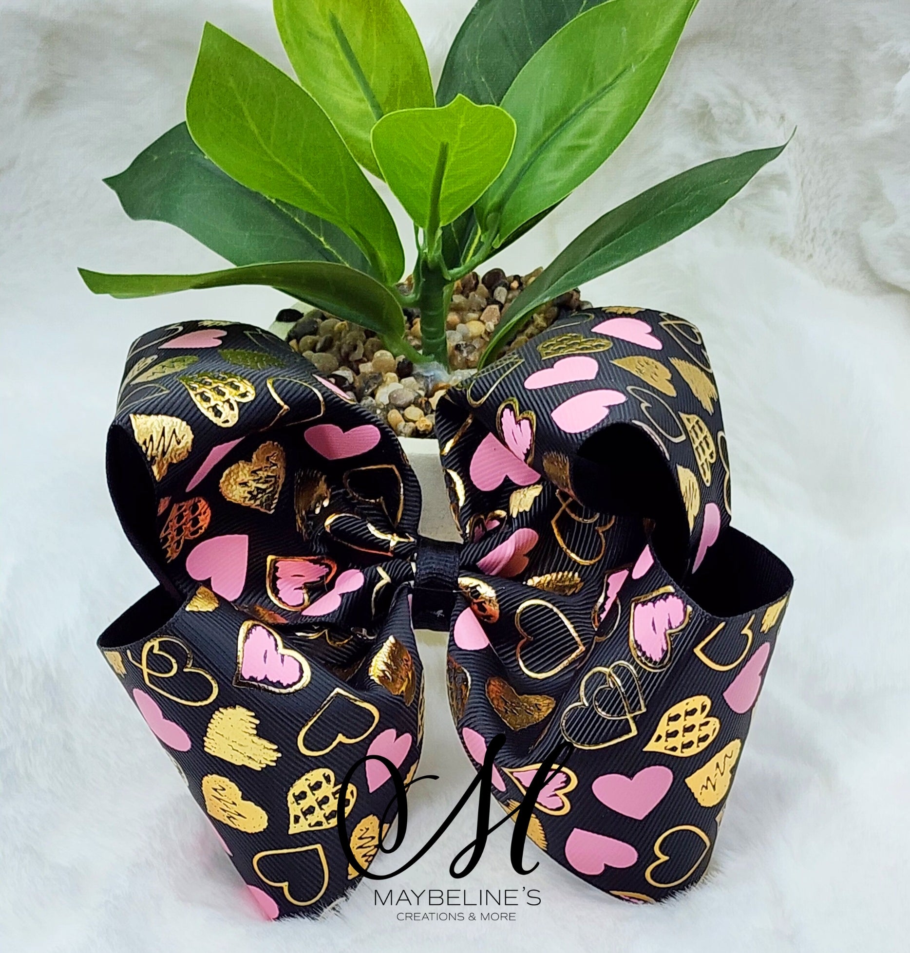 Pink black gold hearts hairbow